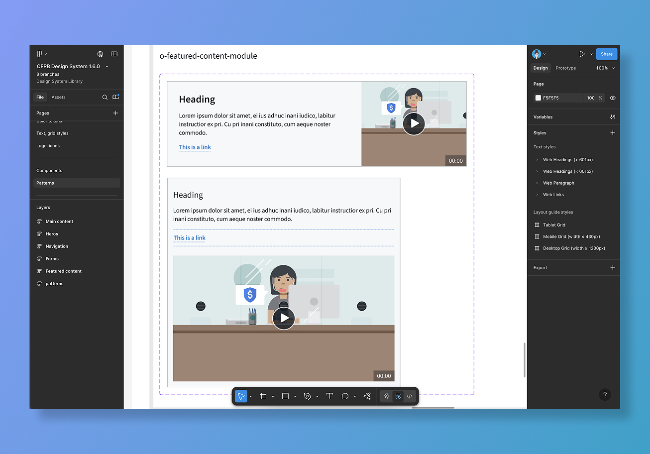 To support rapid prototyping by CFPB product teams, I help maintain a design system Figma library containing components, styles, and variables to be inserted into product design team files. Check out our CFPB Figma community file.