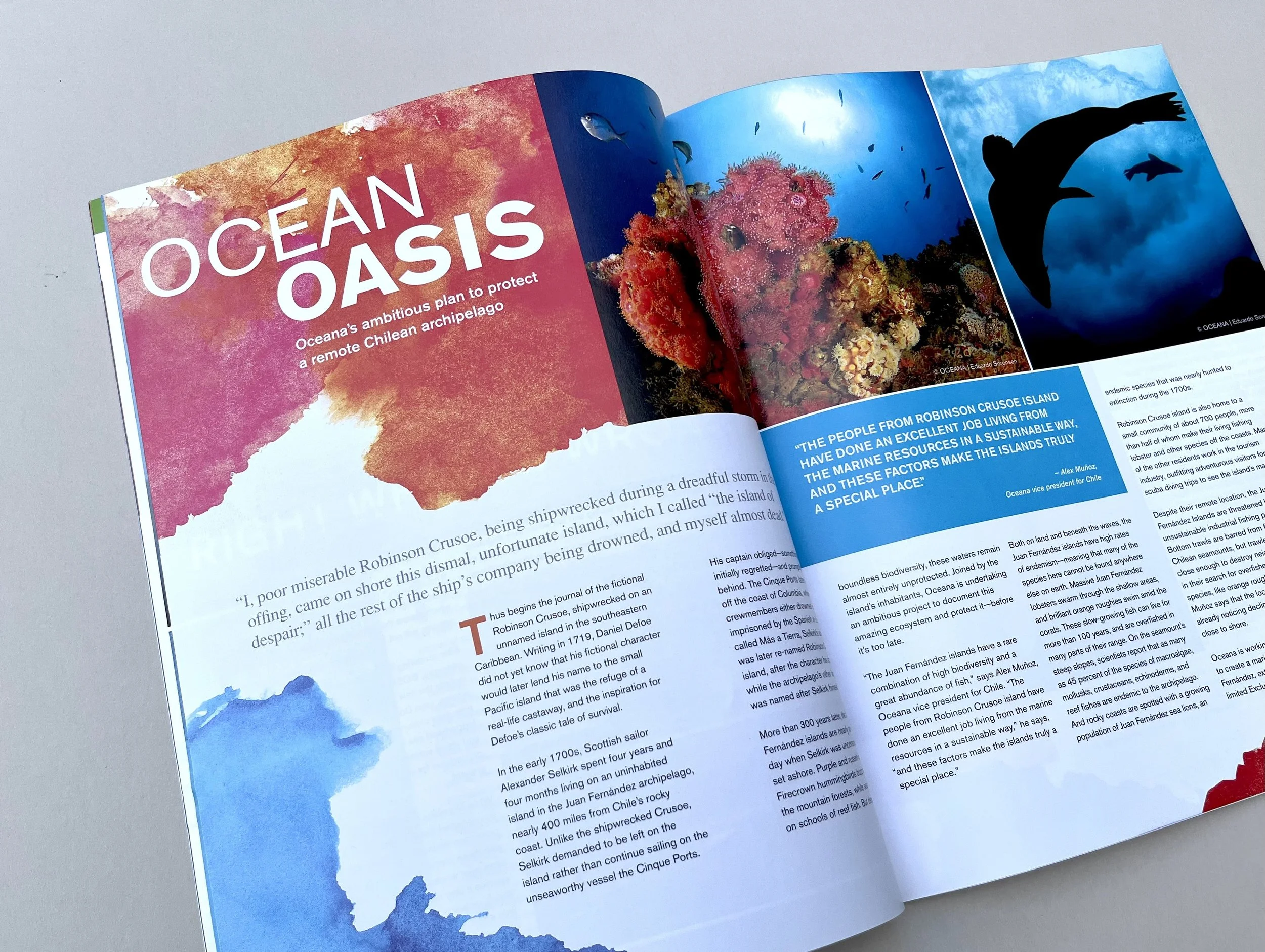 Oceana is the largest international advocacy organization dedicated solely to ocean conservation. To increase donor engagement and support, I designed a tri-annual magazine.